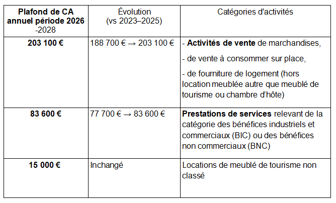 🚨 Important : en cas d'activité mixte (vente et prestations de services), le plafond global reste fixé à 203 100 €, avec une limite spécifique de 83 600 € pour la part correspondant aux prestations de services.